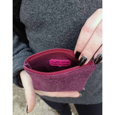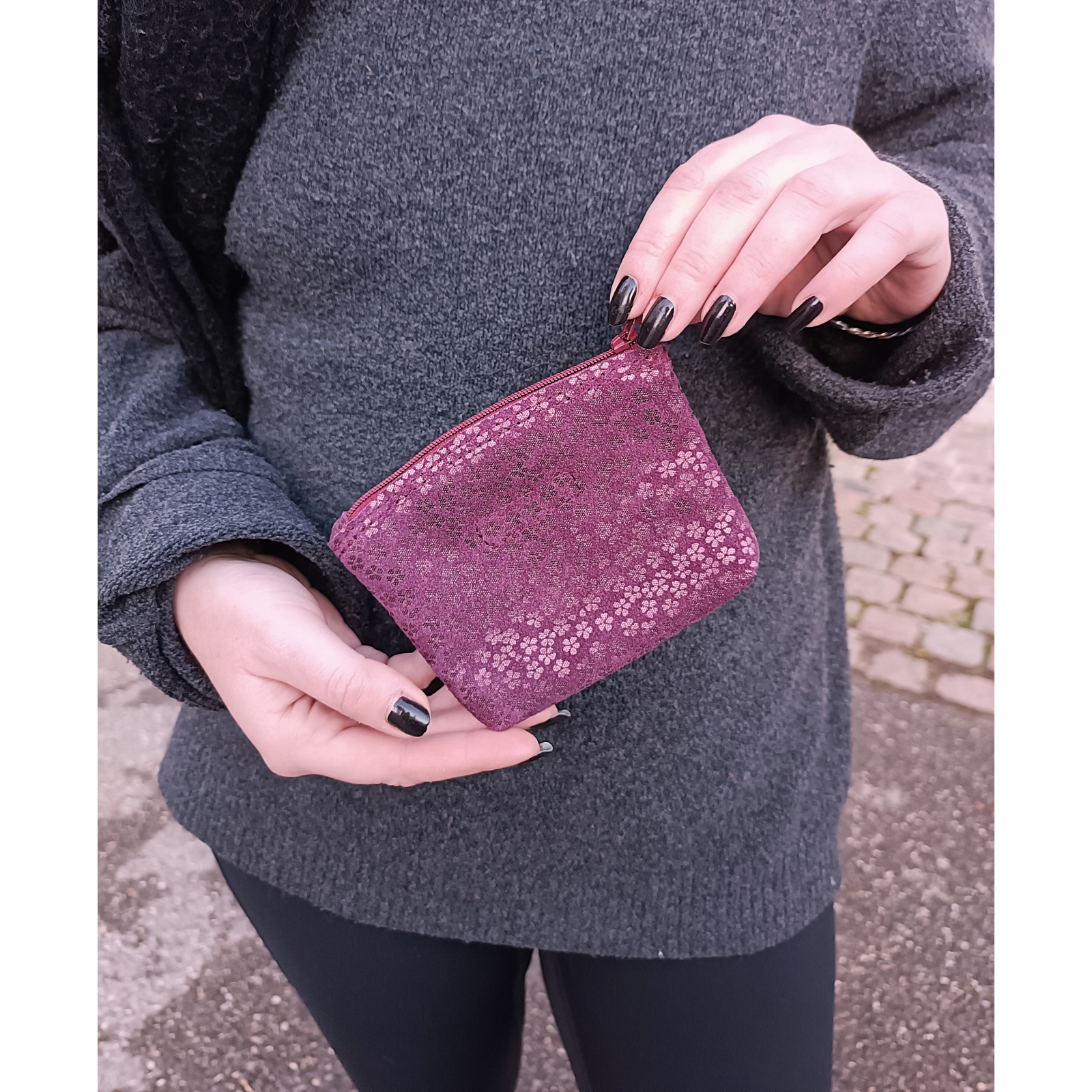 Petite pochette en cuir nubuck prune à fleurs pour pièces, bijoux ou maquillage idée cadeau artisanal
