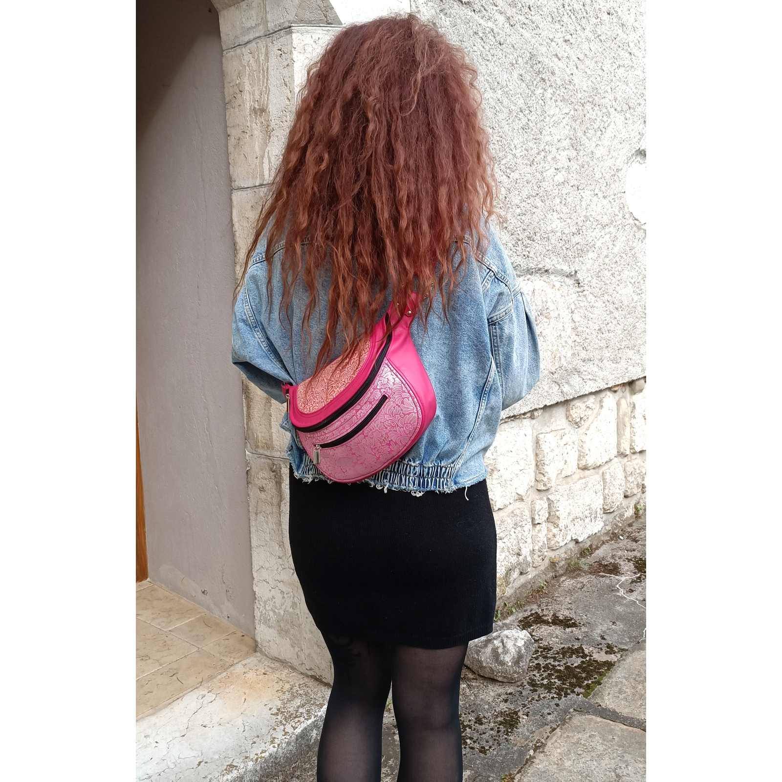 Réalisée en cuir de veau rose et de chèvre dans 2 nuances de rose brillant