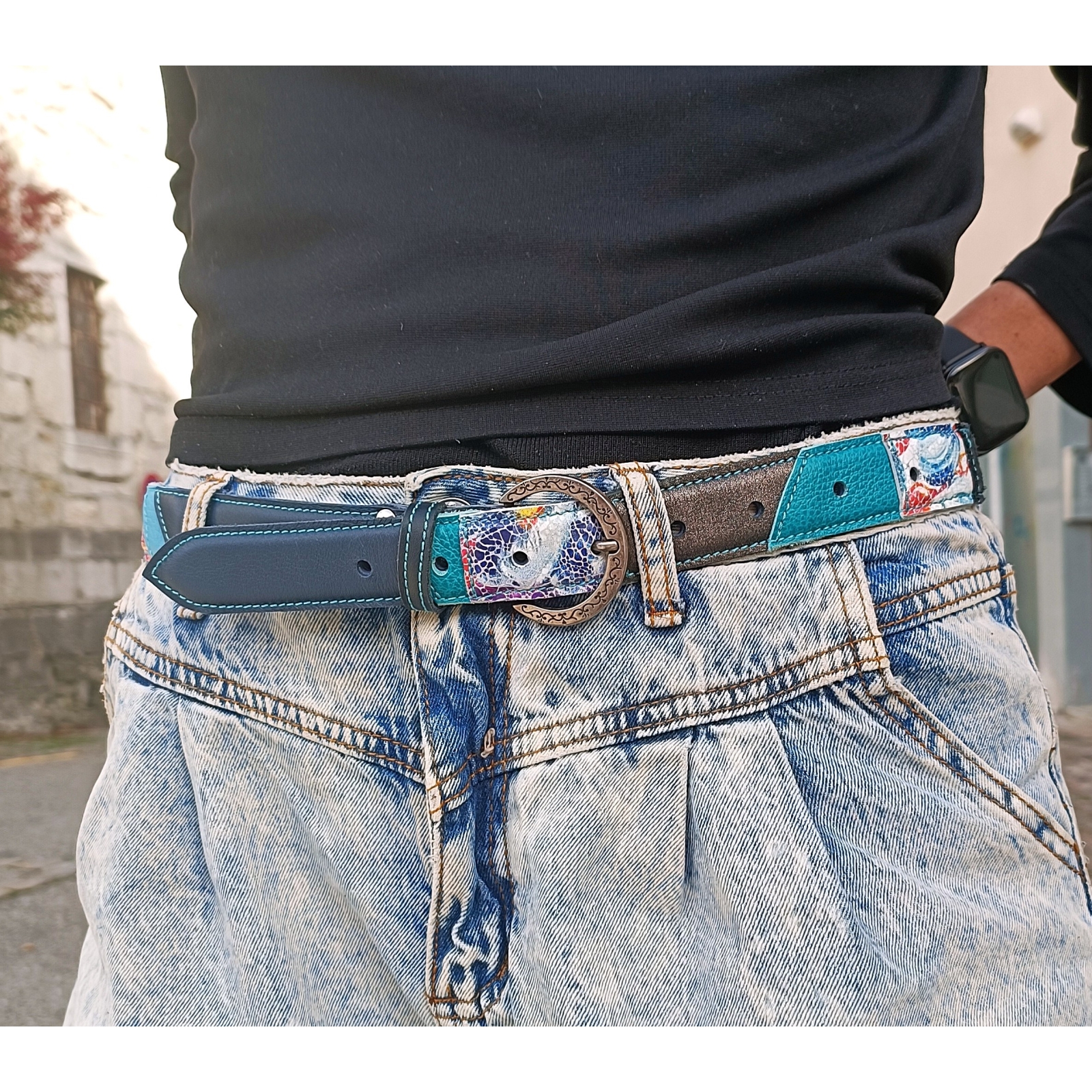 Ceinture artisanale en patchwork de cuir pour fan de bleu