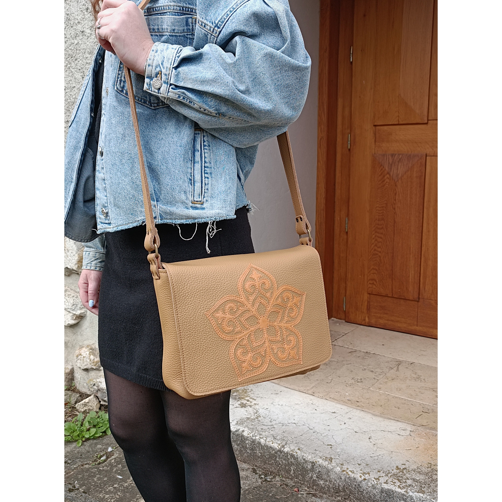 Sac bandoulière avec motif kazakh en cuir souple camel pièce unique made in France