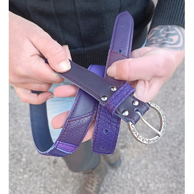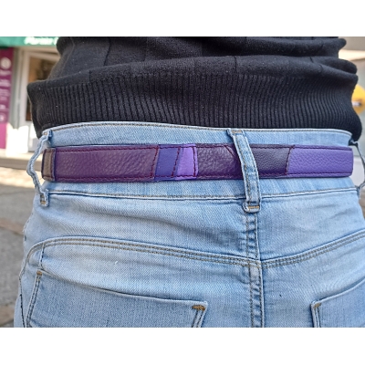 Ceinture artisanale 101 cm en cuir patchwork de cuirs violet taille S/M fabriquée en France
