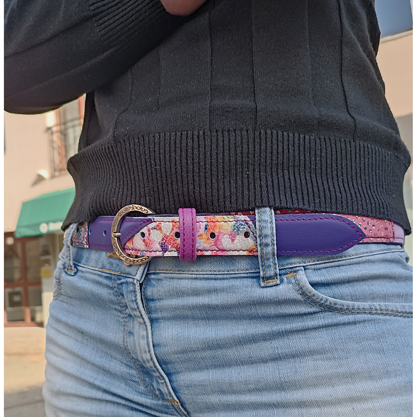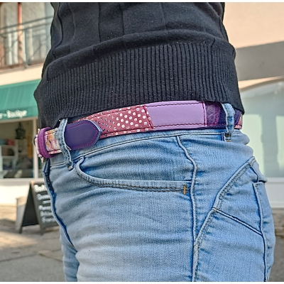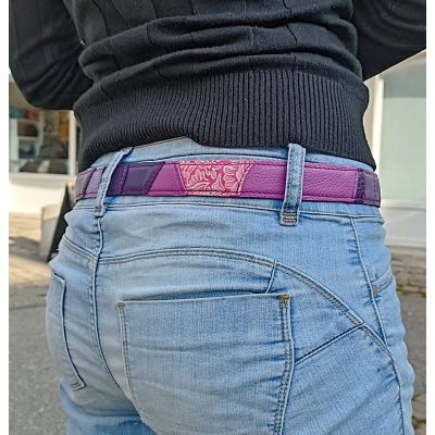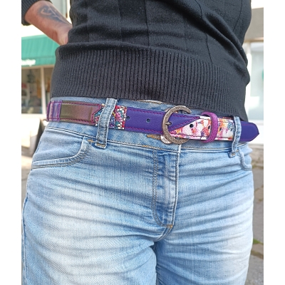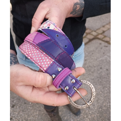 Ceinture 108 cm en cuir patchwork de cuirs rose, fuchsia et violet taille M/L idée cadeau artisanale