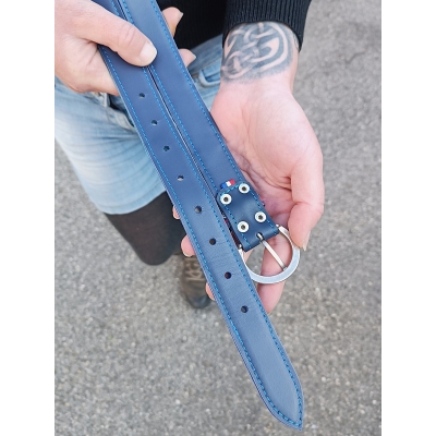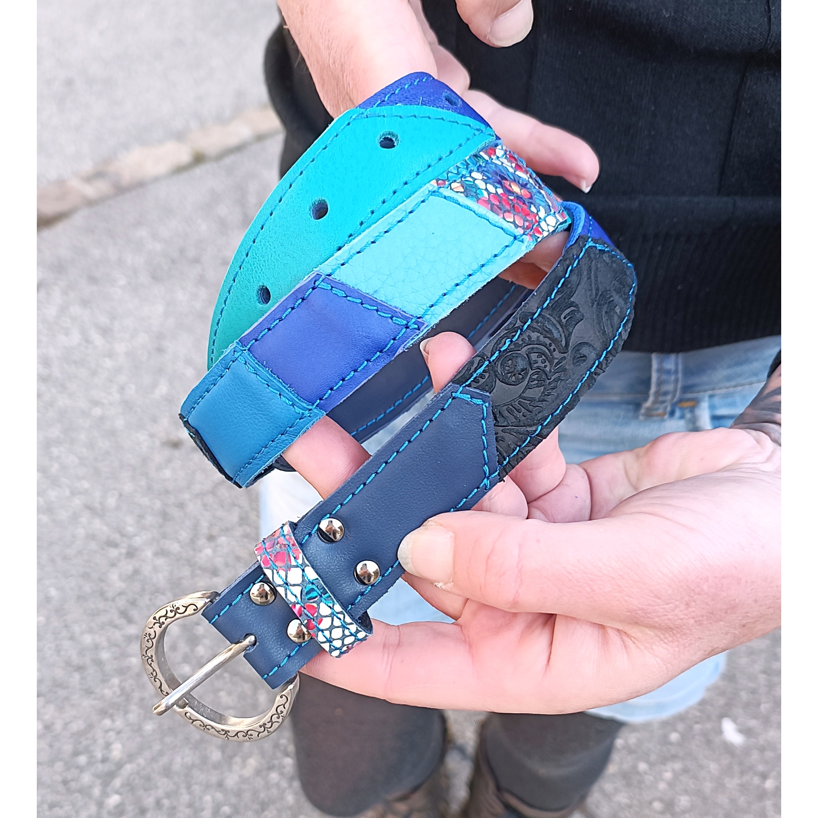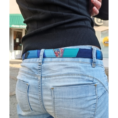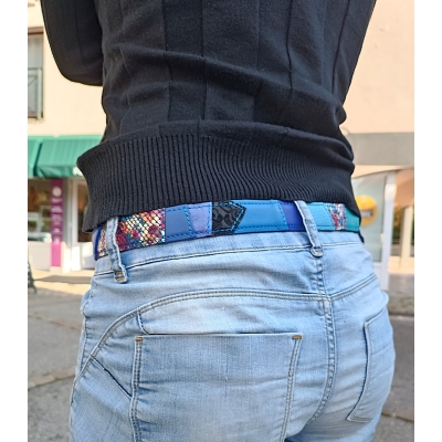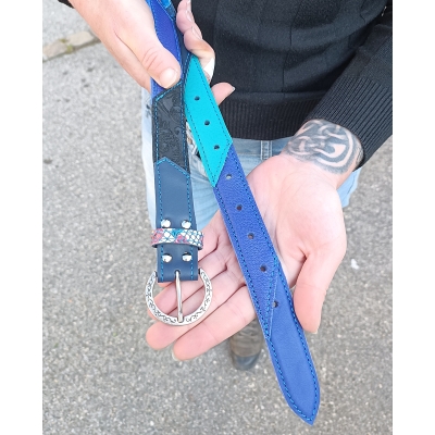 Ceinture 105 cm en cuir patchwork de cuirs bleu, turquoise et noir taille M/L idée cadeau made in France