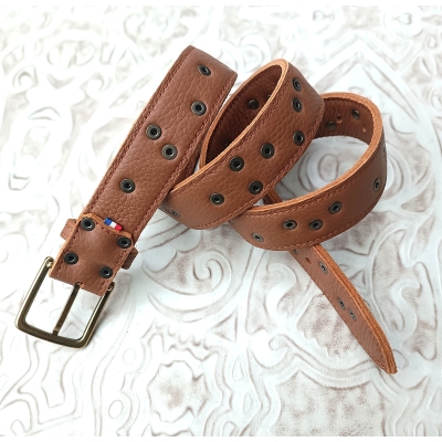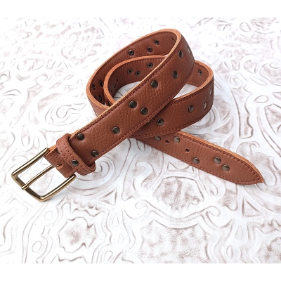 Ceinture cloutée 110 cm en cuir grainé camel taille L idée cadeau artisanale fabriquée en France
