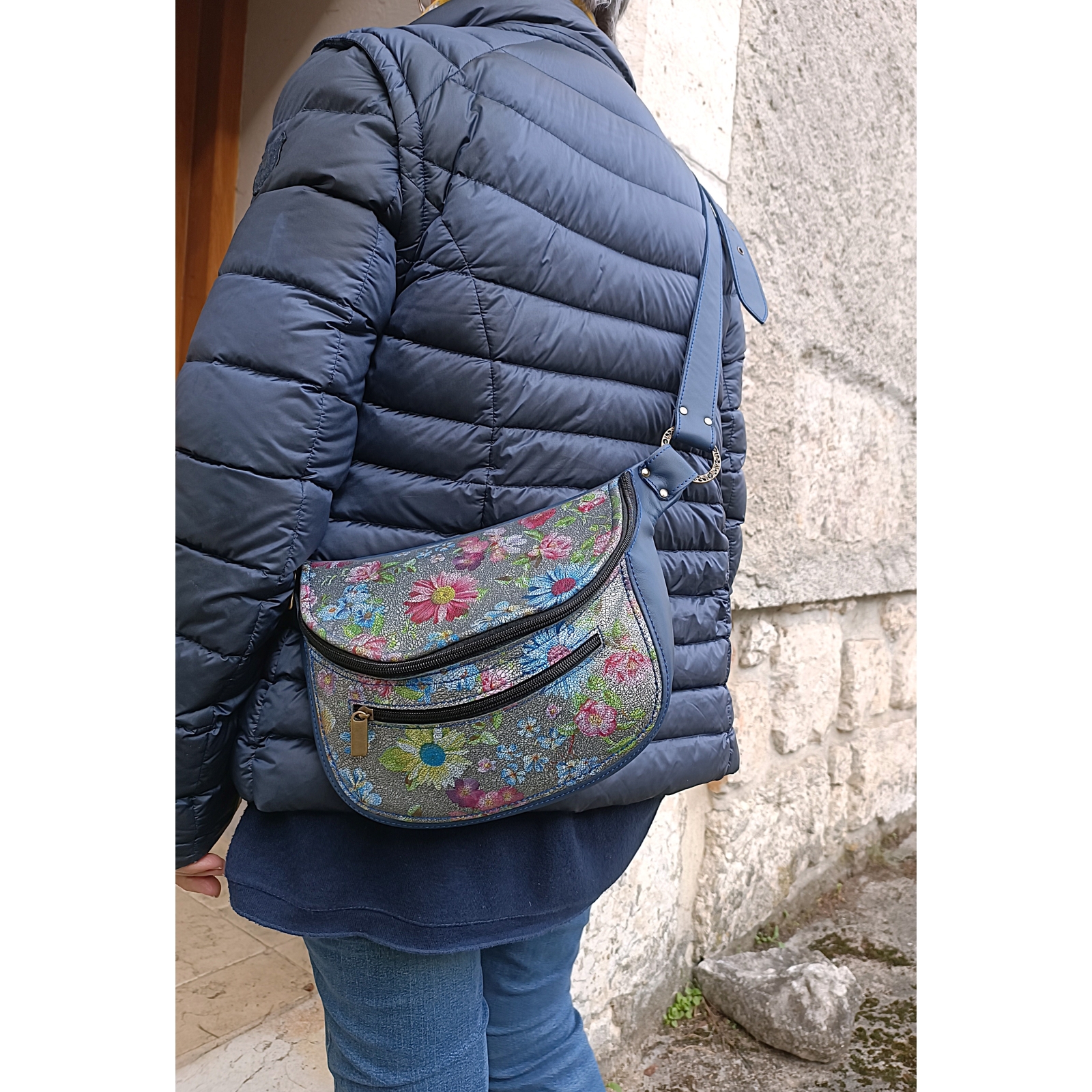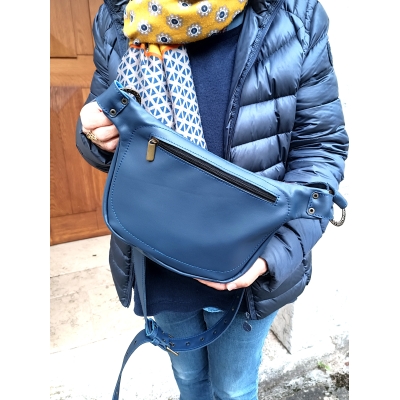 Sac Banane grand format en cuir souple imprimé mosaïque et bleu pièce unique made in France