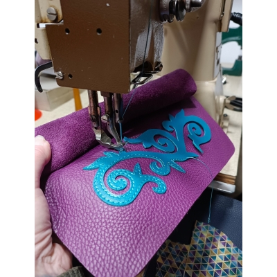 Il est orné d'un motif arabesque turquoise surpiqué sur le rabat, pièce unique.