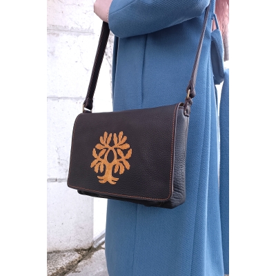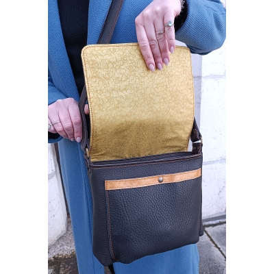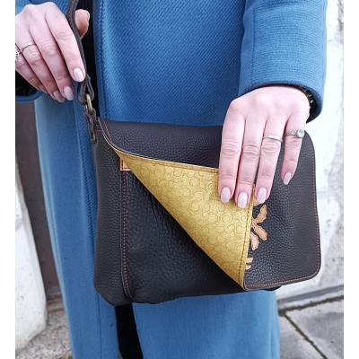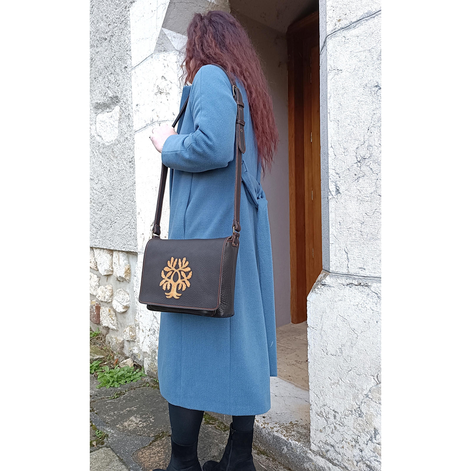 Sac bandoulière en cuir souple couleur café avec chêne pièce unique made in France