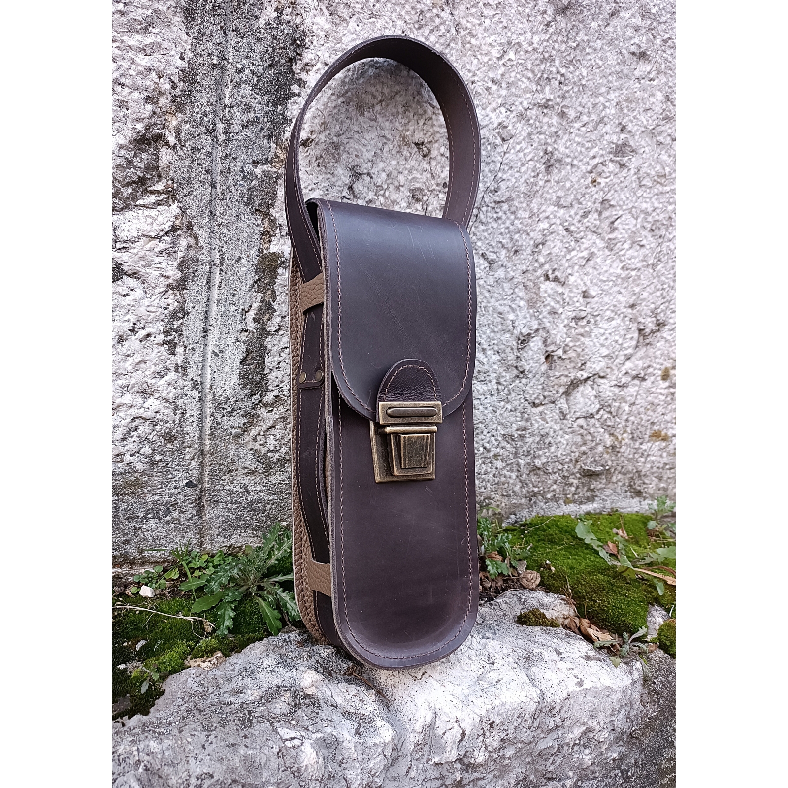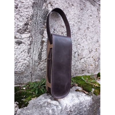 Sacoche artisanale pour 3 boules de pétanque en cuir marron et loutre