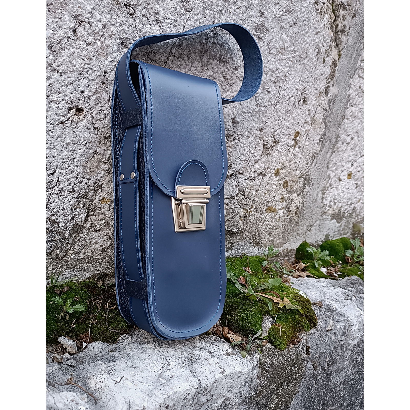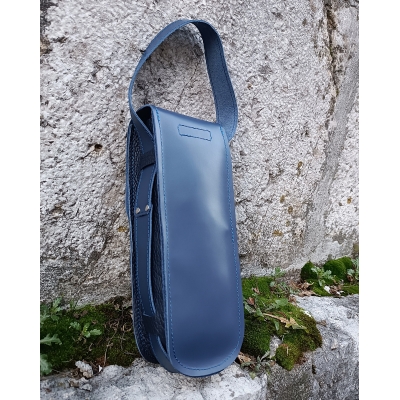 Sacoche artisanale pour 3 boules de pétanque en duo de cuir bleu fabriquée en France