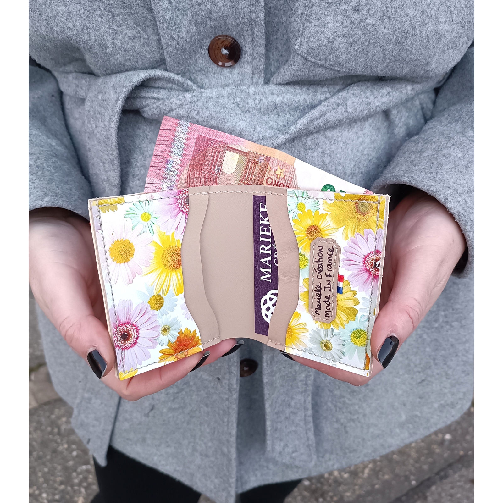 Porte carte en cuir beige et imprimé fleuri idée cadeau artisanal made in France