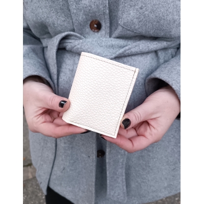 Fermé, il mesure 9.8 cm de haut et 8.4 cm de large, il est réalisé en cuir de taurillon grainé beige pour l'extérieur, de