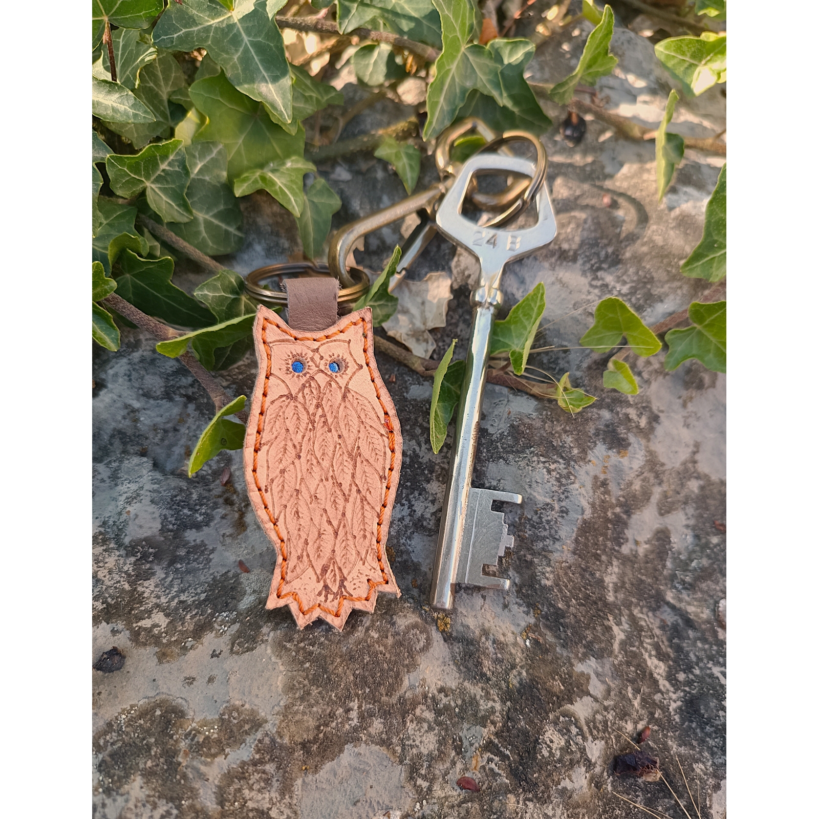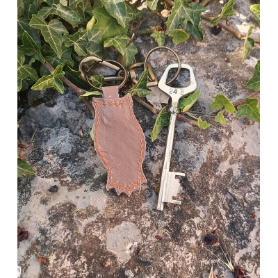 Porte clé artisanal chouette hibou pyrogravé en cuir marron
