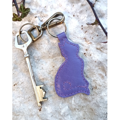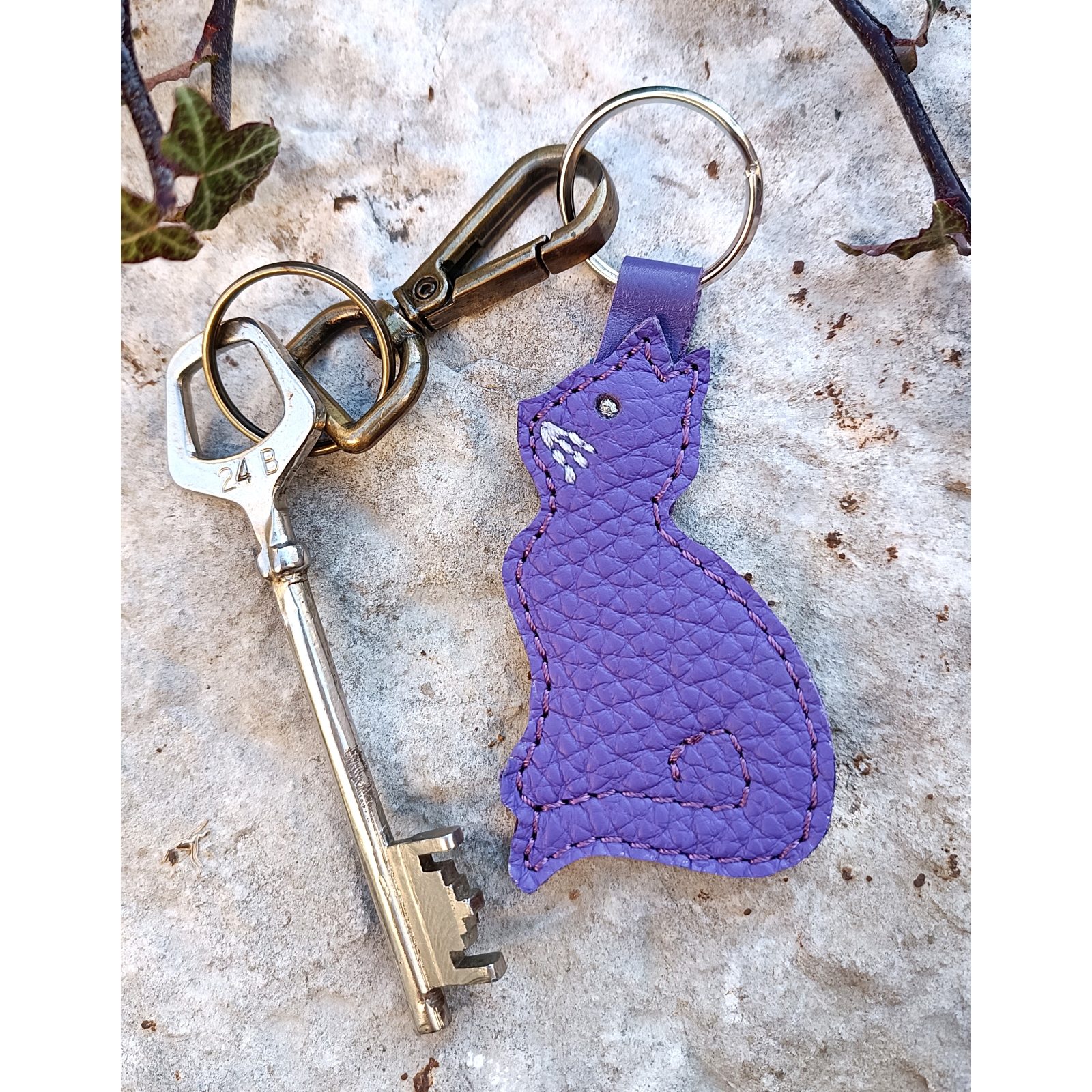Porte clé charme de sac motif chat en cuir violet idée cadeau pour ami des chats fait en France