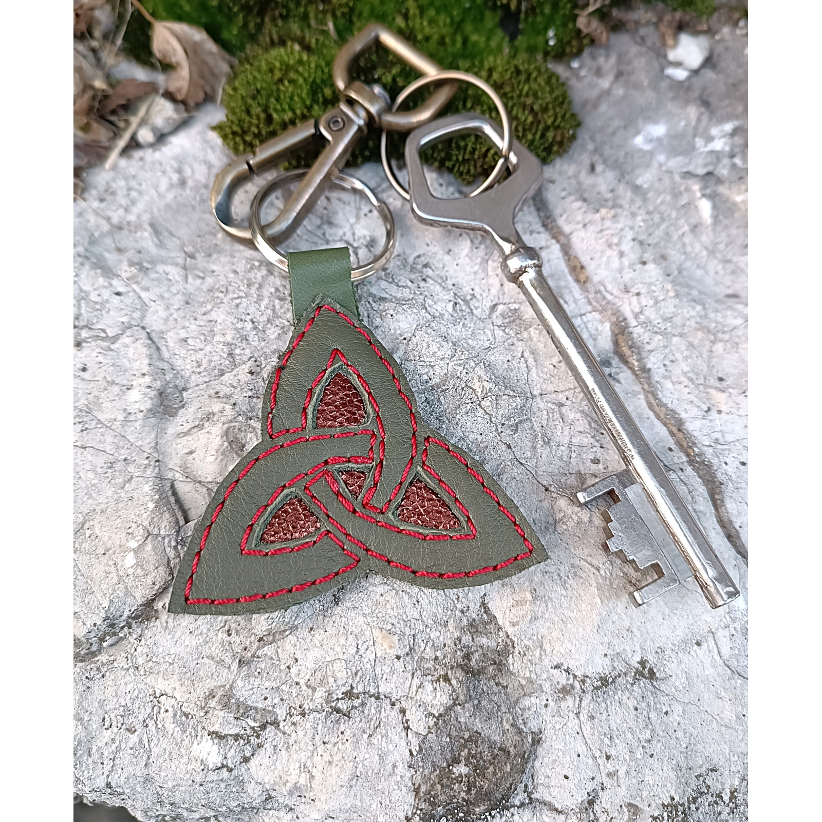 Porte clé en cuir vert et bronze motif triskell, idée cadeau celtique