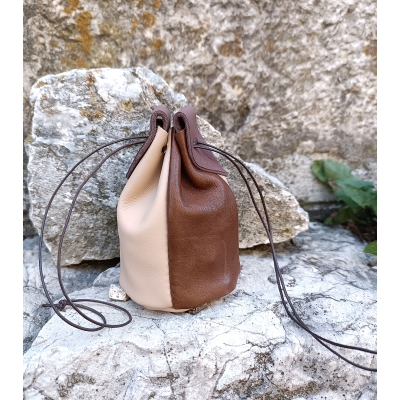 Cette bourse mesure 9,5 cm de haut et le fond, découpé en rond, mesure 6.5 cm de diamètre, elle est réalisée en cuirs
