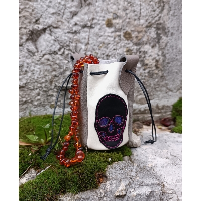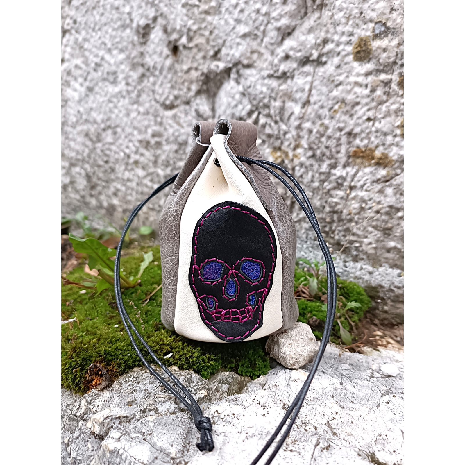 Bourse en cuir souple, idée cadeau artisanal motif skull made in France.