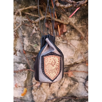 Bourse en cuir souple, idée cadeau artisanal made in France, ornée d'un blason avec dragon pyrogravé.