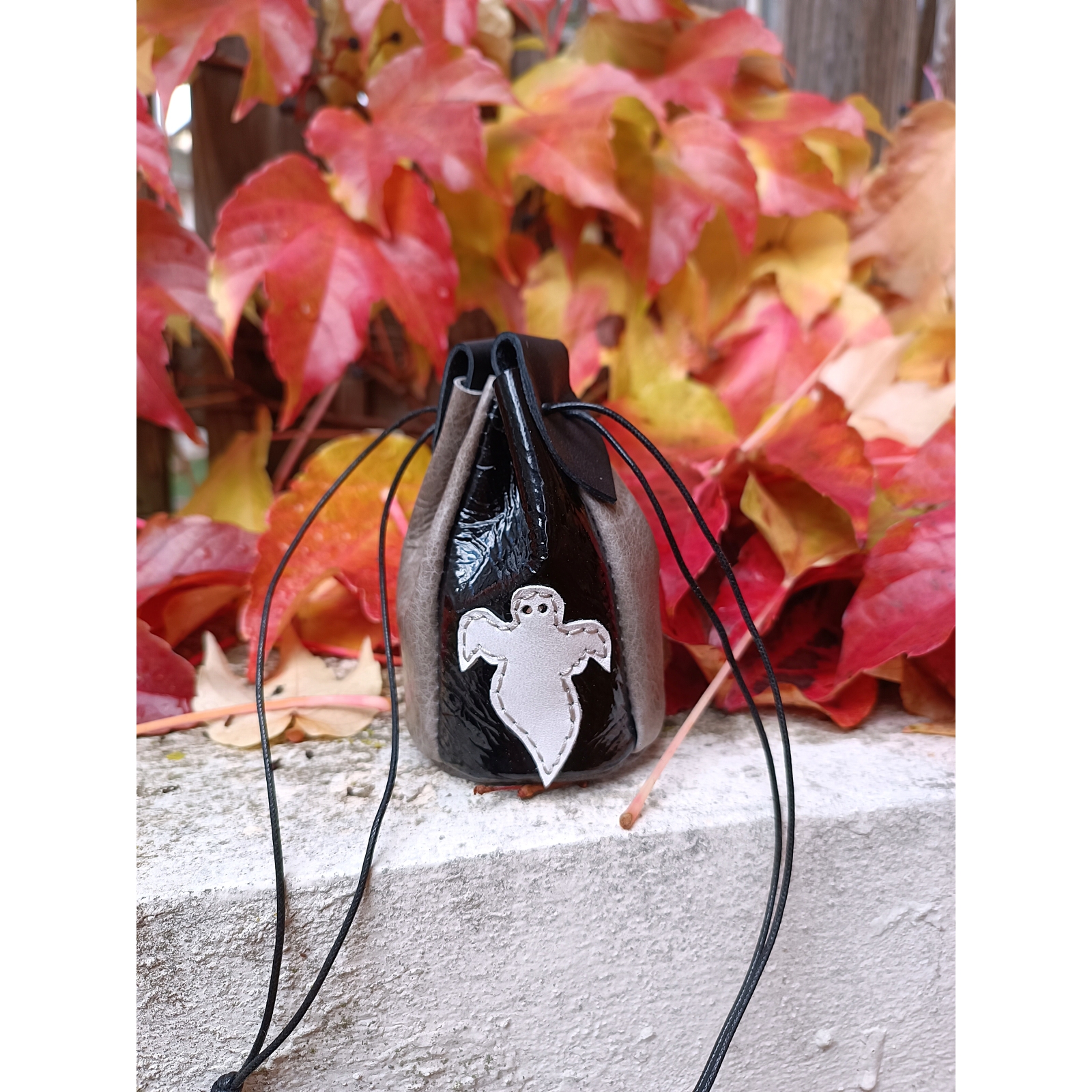 Bourse en cuir souple, idée cadeau artisanal made in France, ornée d'un petit fantôme