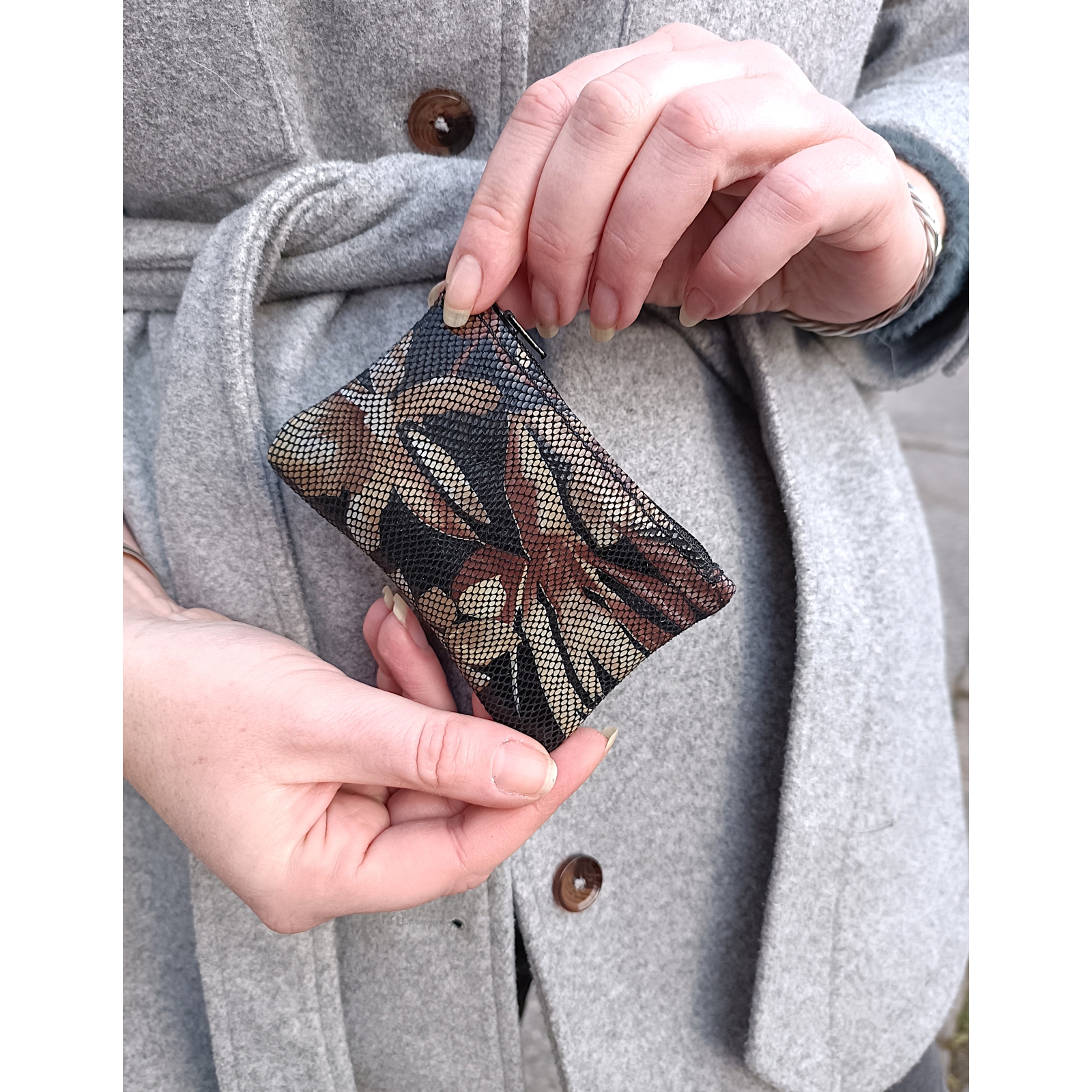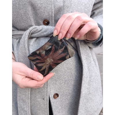Porte monnaie zippé plat petit format en nubuck noir imprimé fleurs