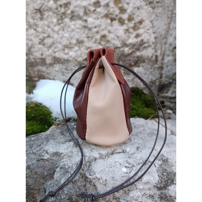 Cette bourse mesure 9,5 cm de haut et le fond, découpé en rond, mesure 6.5 cm de diamètre, elle est réalisée en cuirs