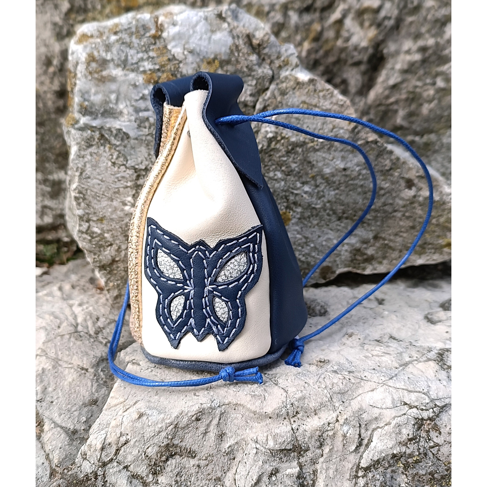 Bourse avec papillon bleu en cuir idée cadeau artisanal