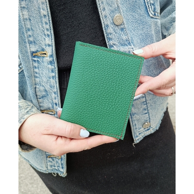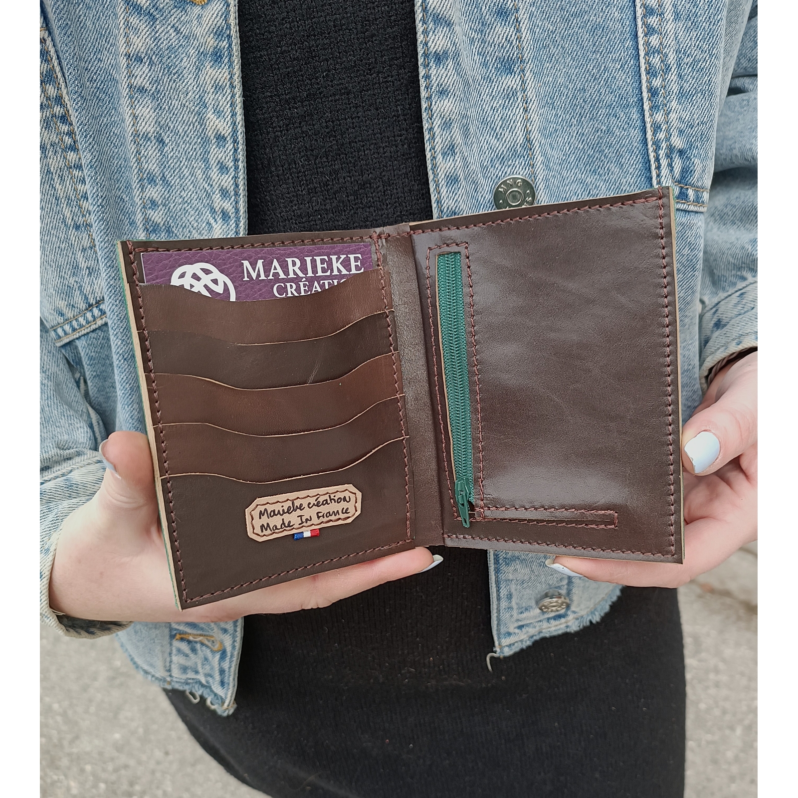 Portefeuille d'artisan en cuir vert et marron fabriqué en France
