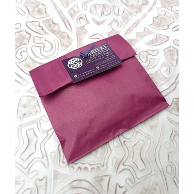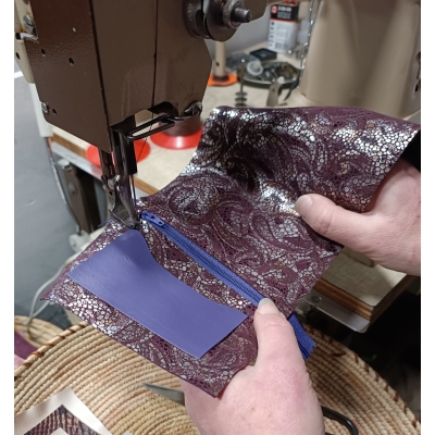 Réalisé à Cruseilles à l’atelier MARIEKE CREATION, en cuir souple nubuck de chèvre prune imprimé d'arabesques