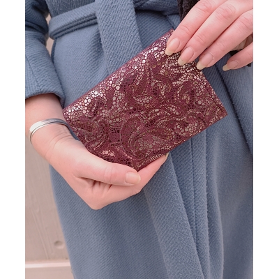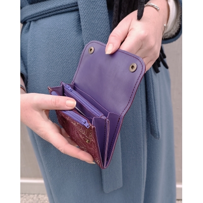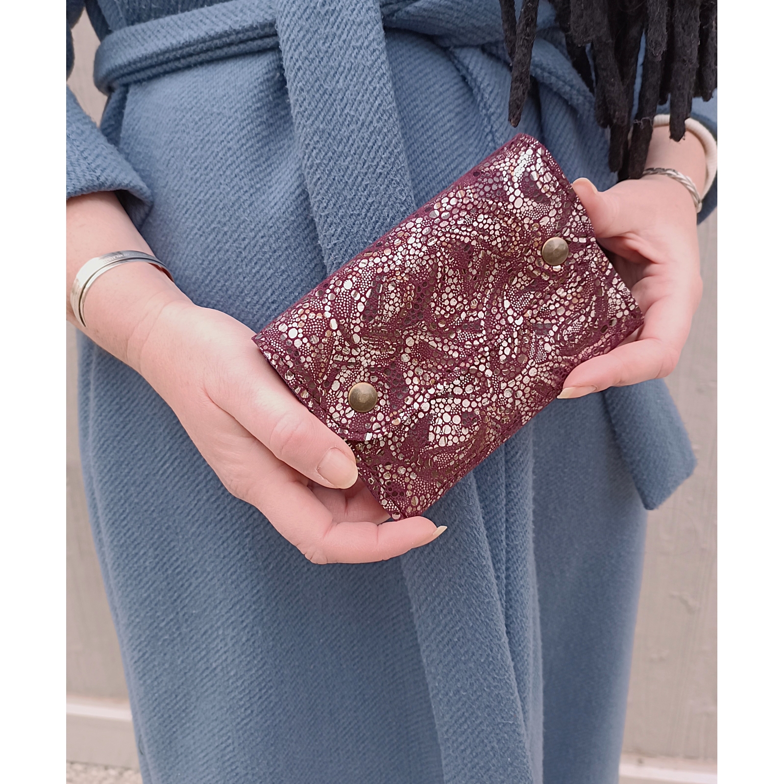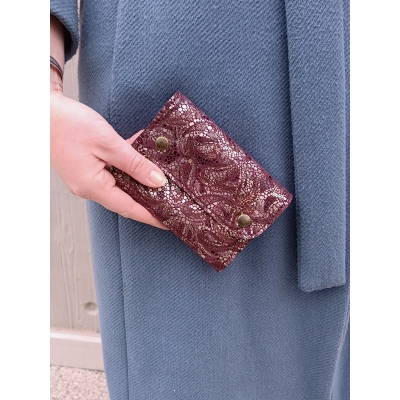 Portefeuille femme en cuir souple prune imprimé arabesques, pièce unique made in France