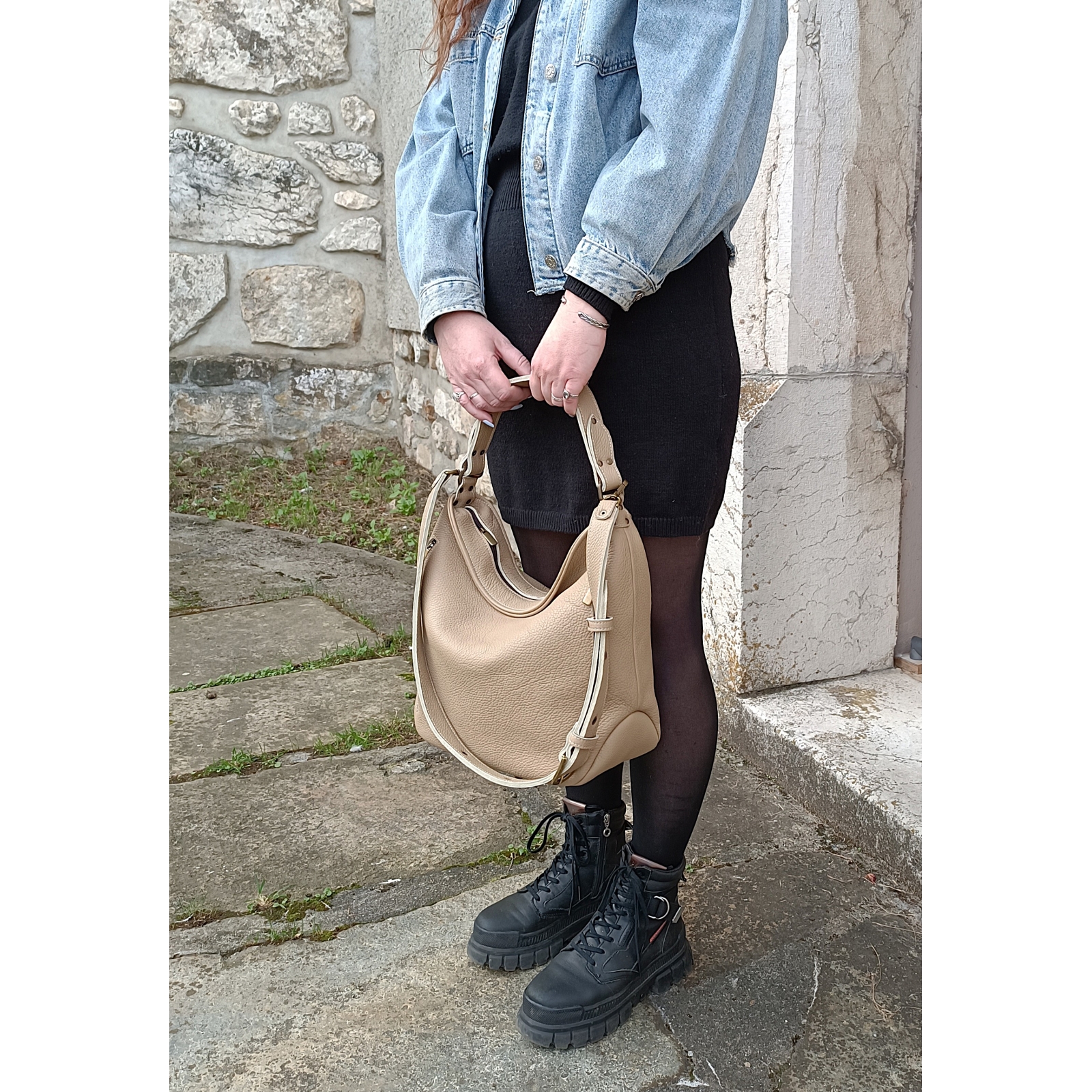 Ce sac a deux bandoulières, pour porter soit à l'épaule soit en bandoulière, soit à la main, la plus longue est réglable et