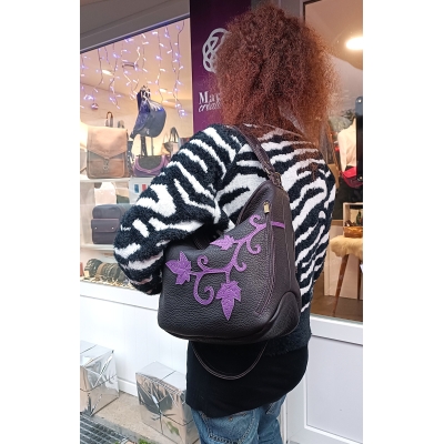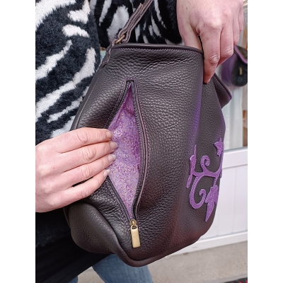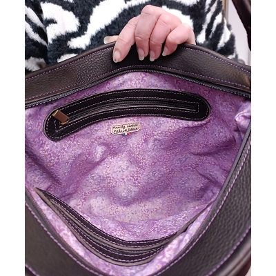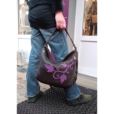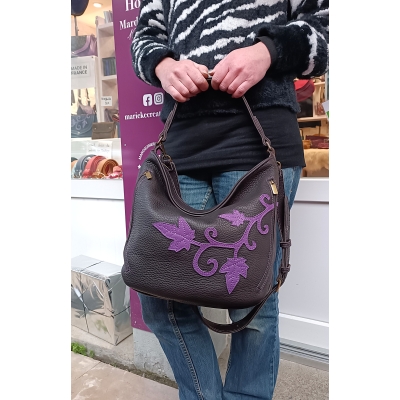 Réalisé en cuir grainé de taurillon de couleur café, ce cuir est très agréable au toucher, orné d'un branchage violet