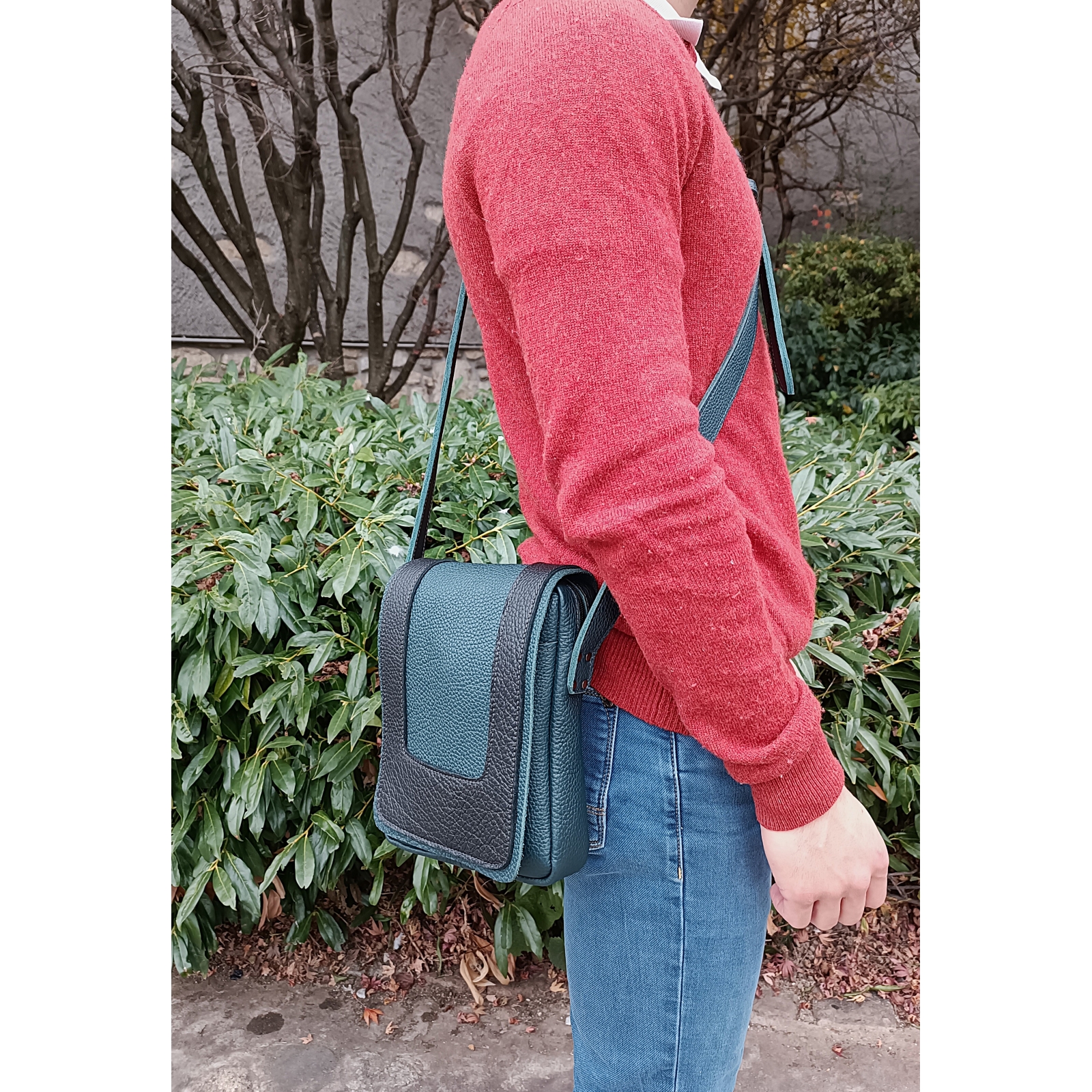 Sac bandoulière unisexe en cuir grainé souple vert et noir pièce unique idée cadeau made in France