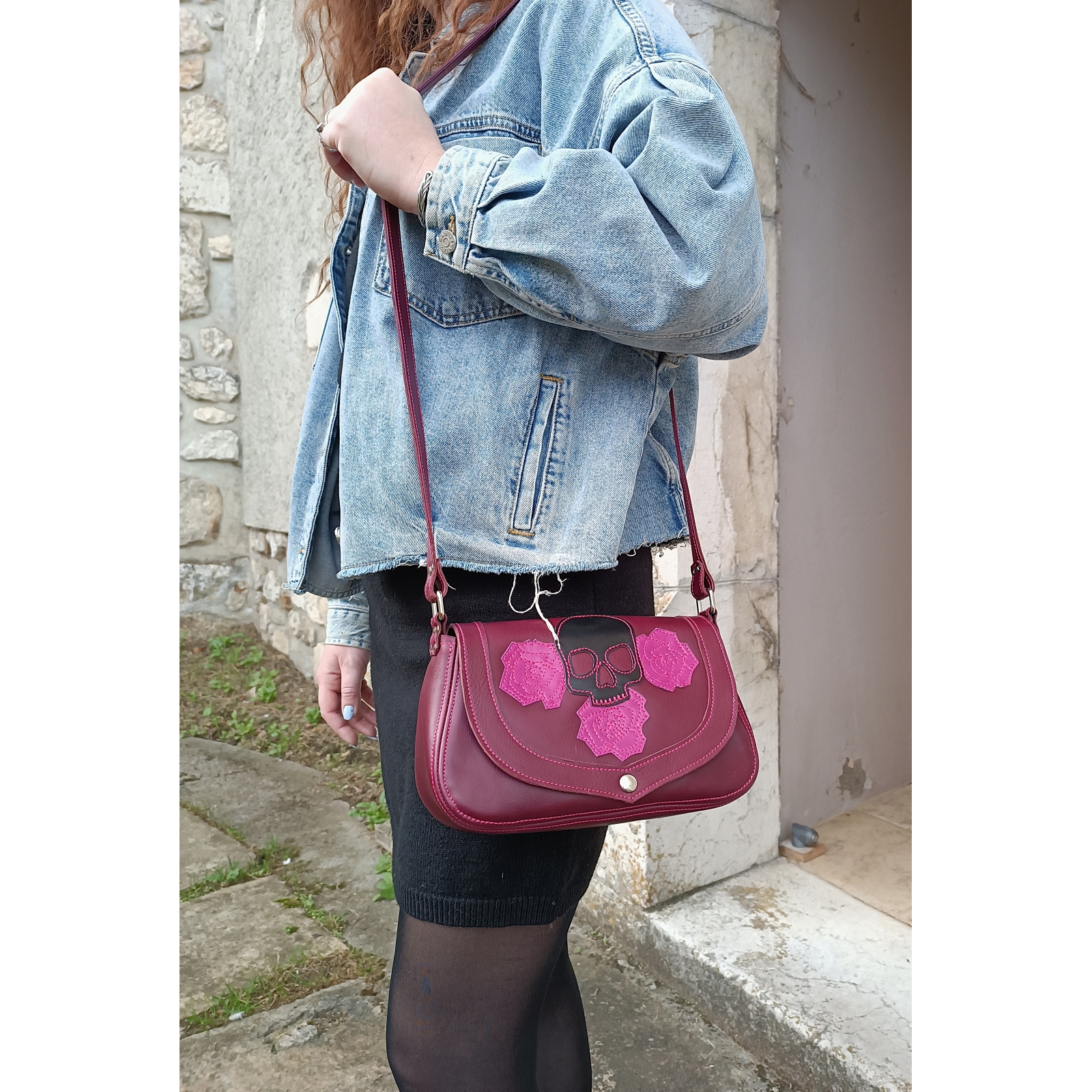 Sac bandoulière de petit format en cuir souple avec skull and roses pièce unique fabriquée en France
