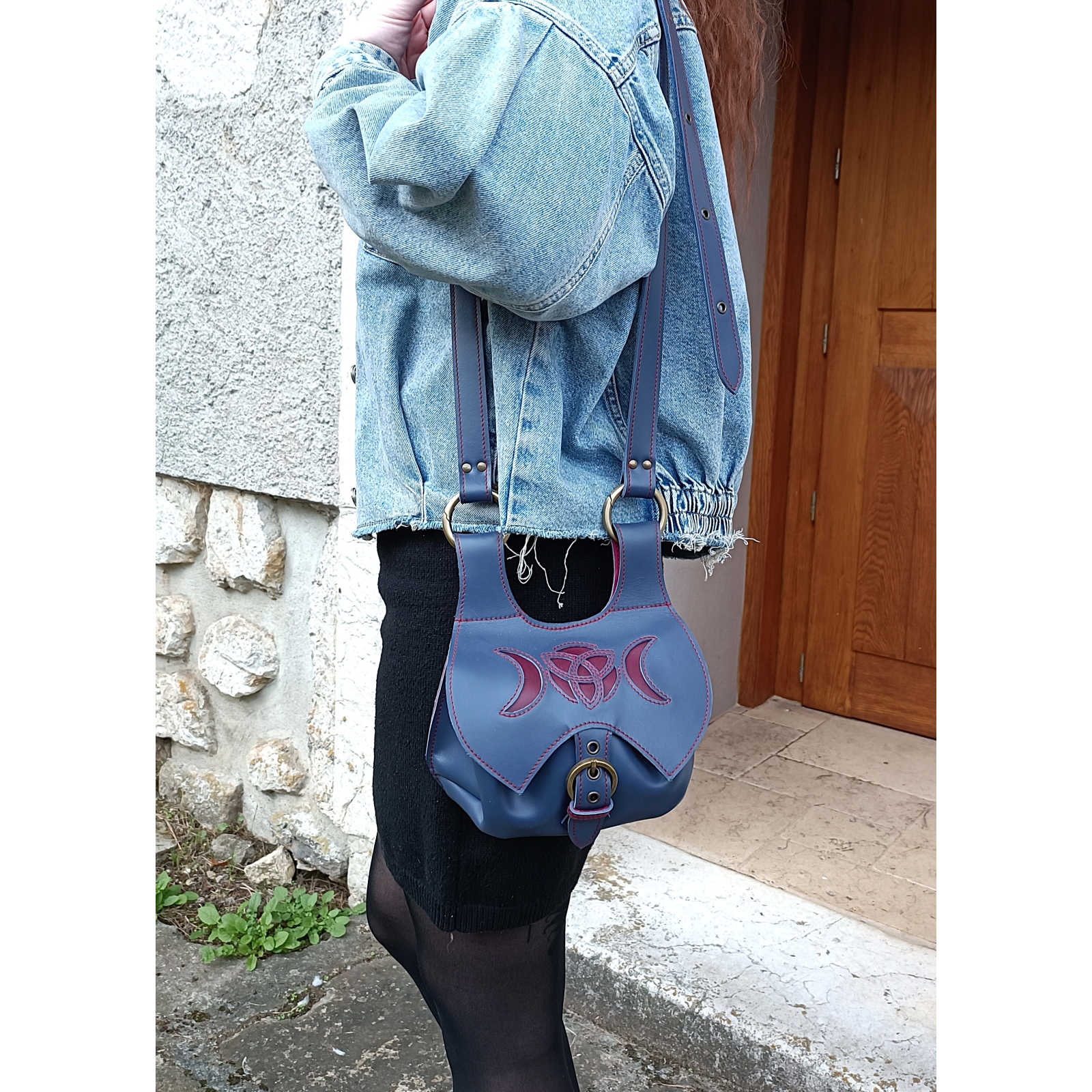 Sac bandoulière et/ou escarcelle en cuir bleu avec triple lune pièce unique fabriquée en Haute Savoie