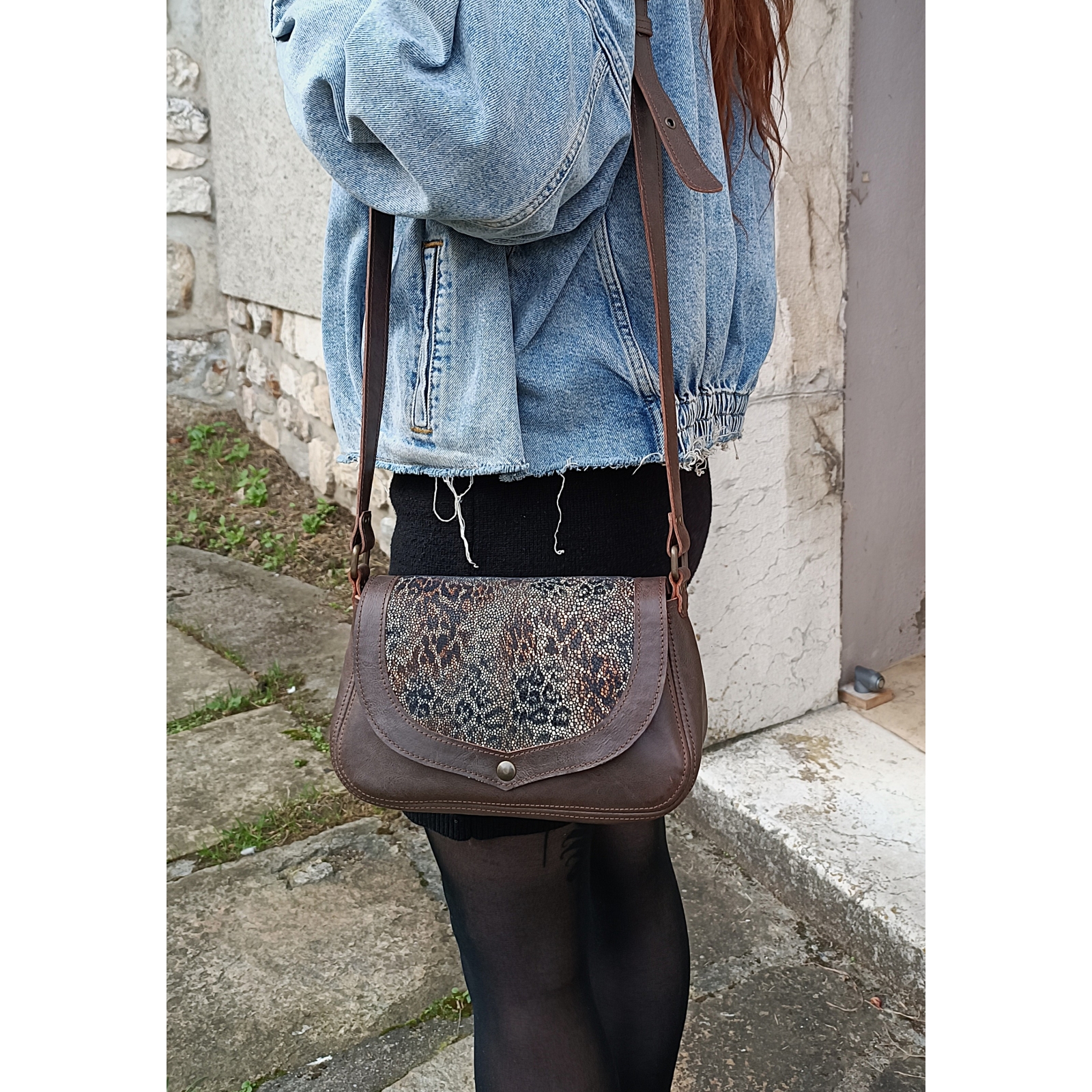 Sac bandoulière de petit format en cuir souple marron et imprimé léopard pièce unique fabriquée en France