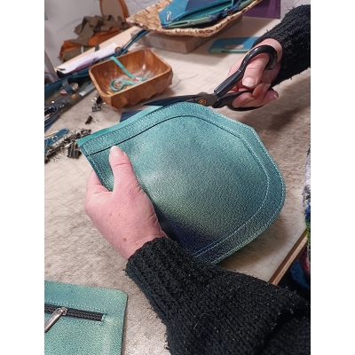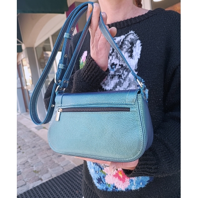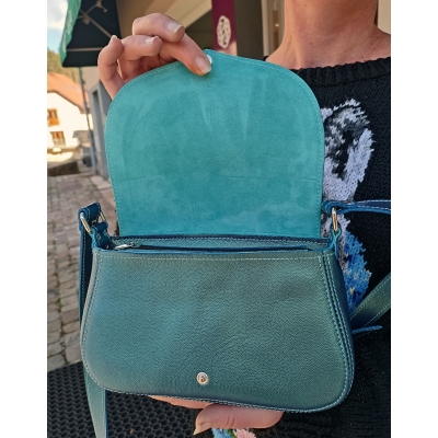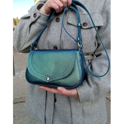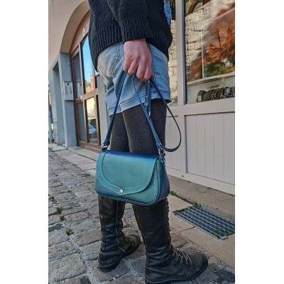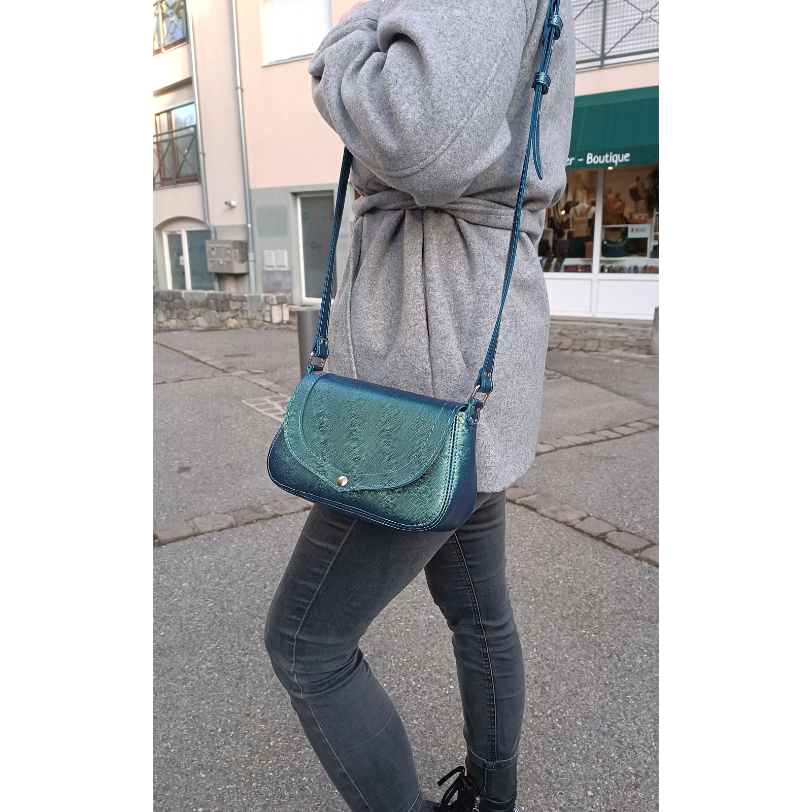 Sac bandoulière de petit format en cuir souple émeraude irisé pièce unique fabriquée en France