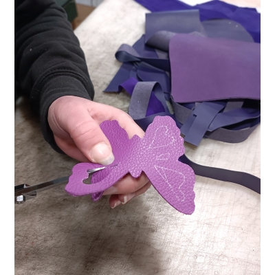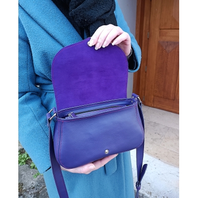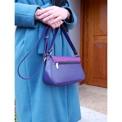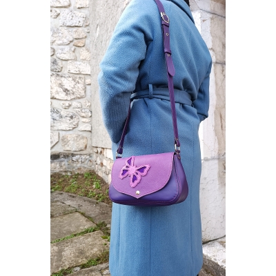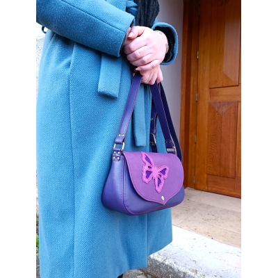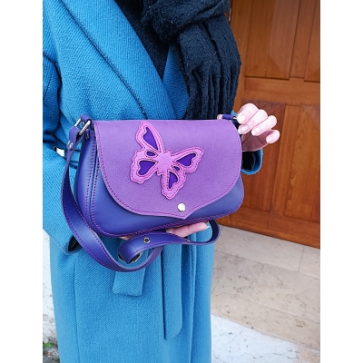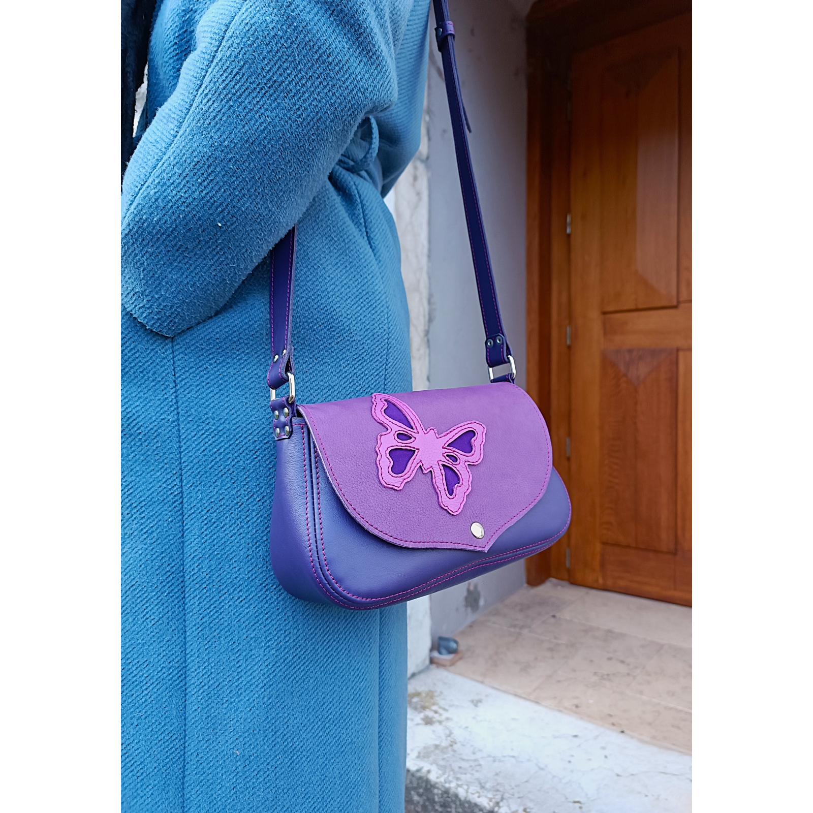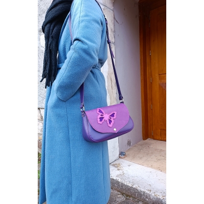 Sac bandoulière de petit format en cuir souple violet avec papillon pièce unique fabriquée en France