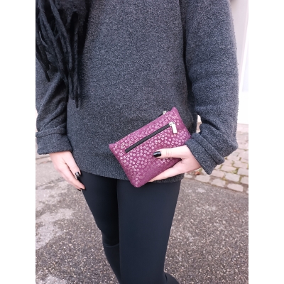 Trousse zippée multi fonction en cuir prune imprimé fleurs fabriquée en France