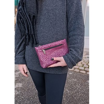 Trousse zippée en cuir souple prune imprimé de fleurs idée cadeau artisanal fabriqué en France