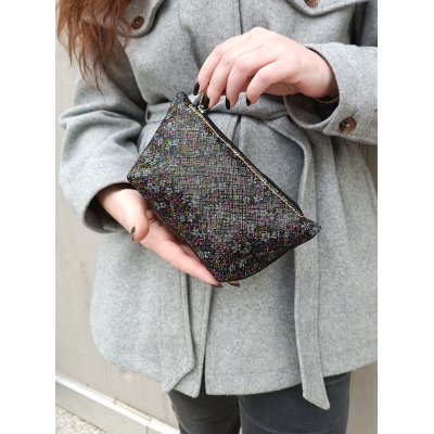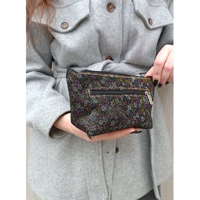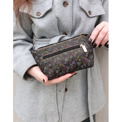 Réalisé en cuir souple de chèvre nubuck imprimé fleuri sur fond noir, elle comporte une poche zippée d'ouverture
