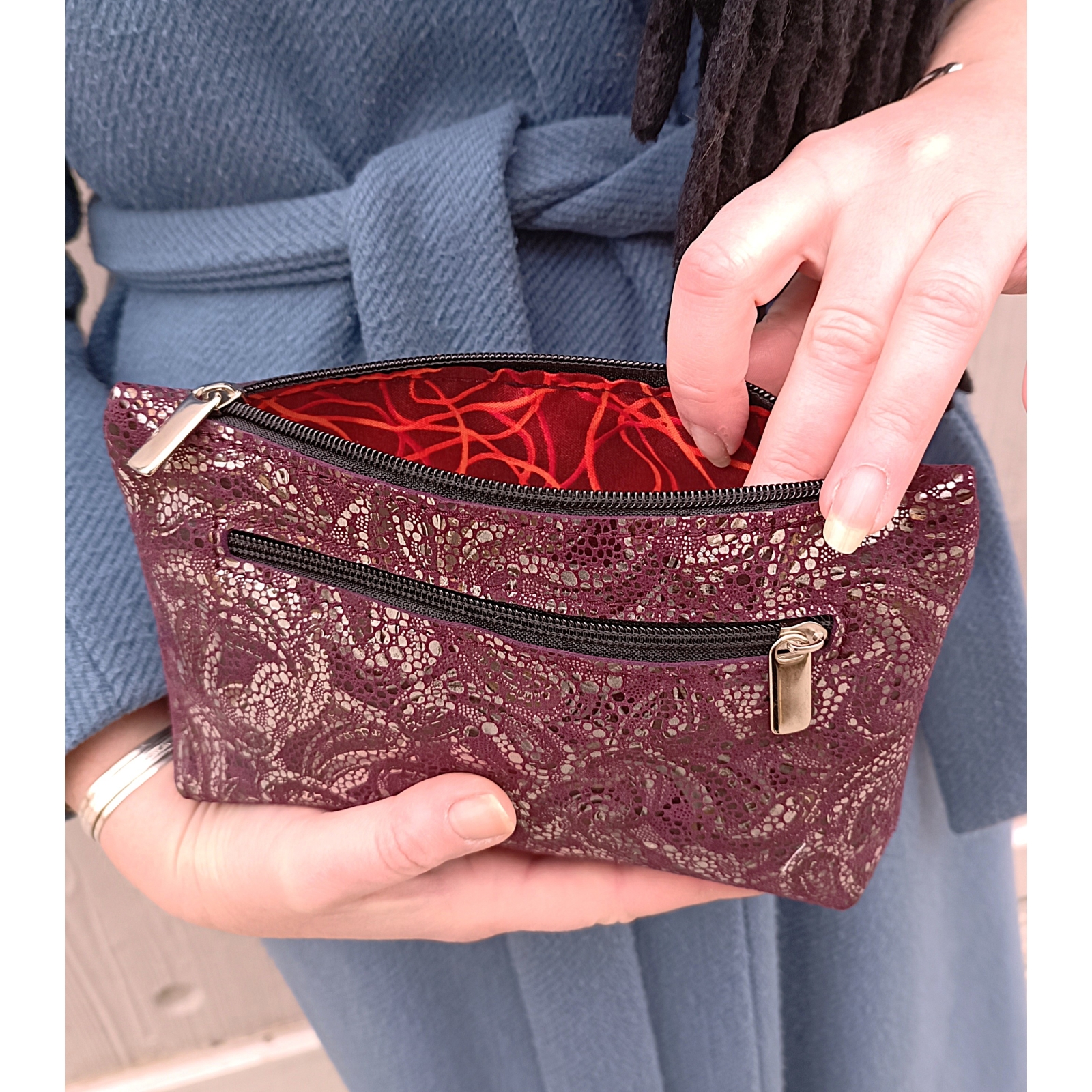 Pochette fourre tout, trousse à maquillage, à couture, réalisée en cuir souple nubuck prune imprimé d'arabesques