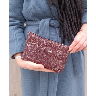 Trousse zippée en cuir souple prune avec arabesques idée cadeau artisanal fabriqué en France
